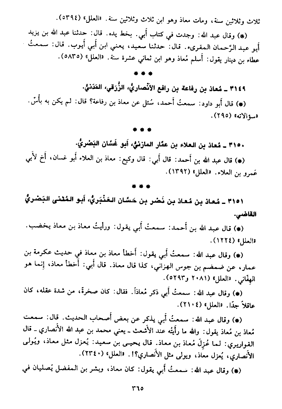 • وقال عبد الله: سمعتُ أَبي ذكر معاذًا، فقال: كان صخرة، من شدة عقله، كان عاقلاً جدًا. «العلل» (2104) .