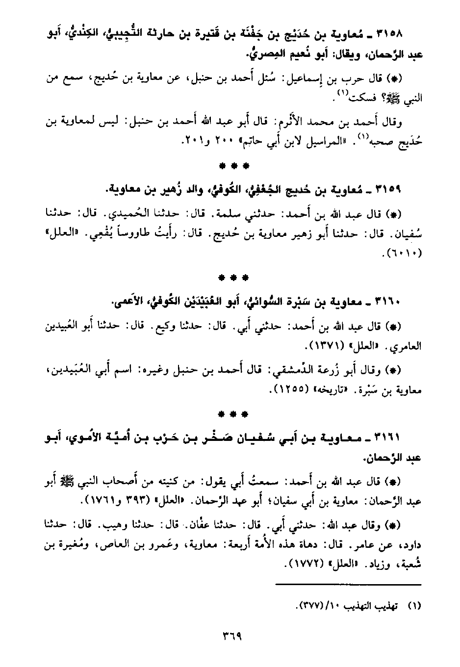 • قال عبد الله بن أحمد: سمعتُ أَبي يقول: من كنيته من أصحاب النبي - صلى الله عليه وسلم - أبو عبد الرحمن: معاوية بن أبي سفيان؛ أبو عبد الرحمن. «العلل» (393 و1761) .