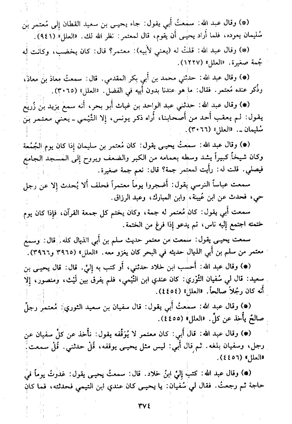 • وقال عبد الله: سمعتُ أَبي يقول: جاء يحيى بن سعيد القطان إلى معتمر بن سليمان يعوده، فلما أراد يحيى أن يقوم، قال لمعتمر: نظر الله لك. «العلل» (941) .