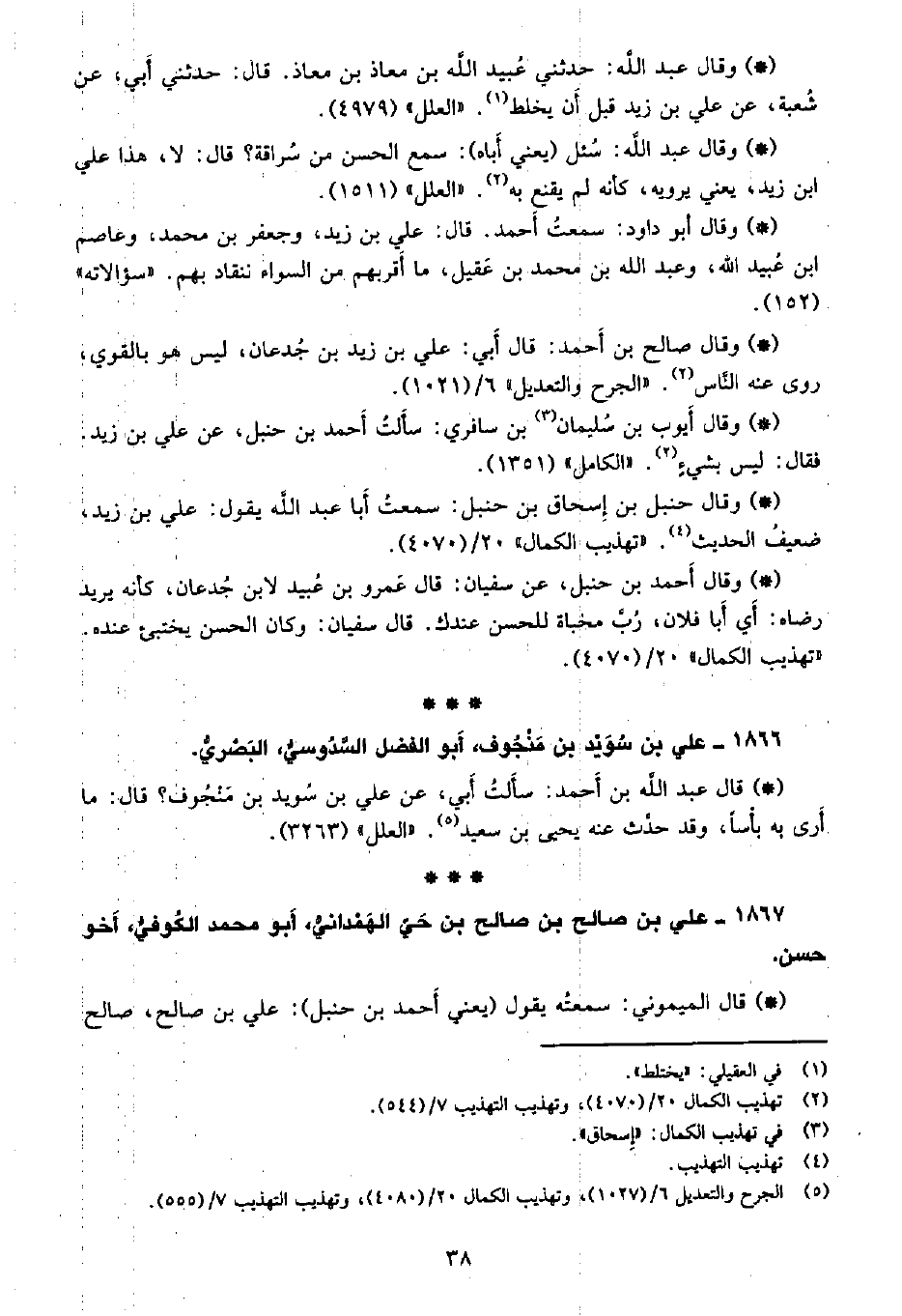 • وقال صالح بن أحمد: قال أبي: علي بن زيد بن جدعان، ليس هو بالقوي، روى عنه الناس. «الجرح والتعديل» 6/ (1021) .