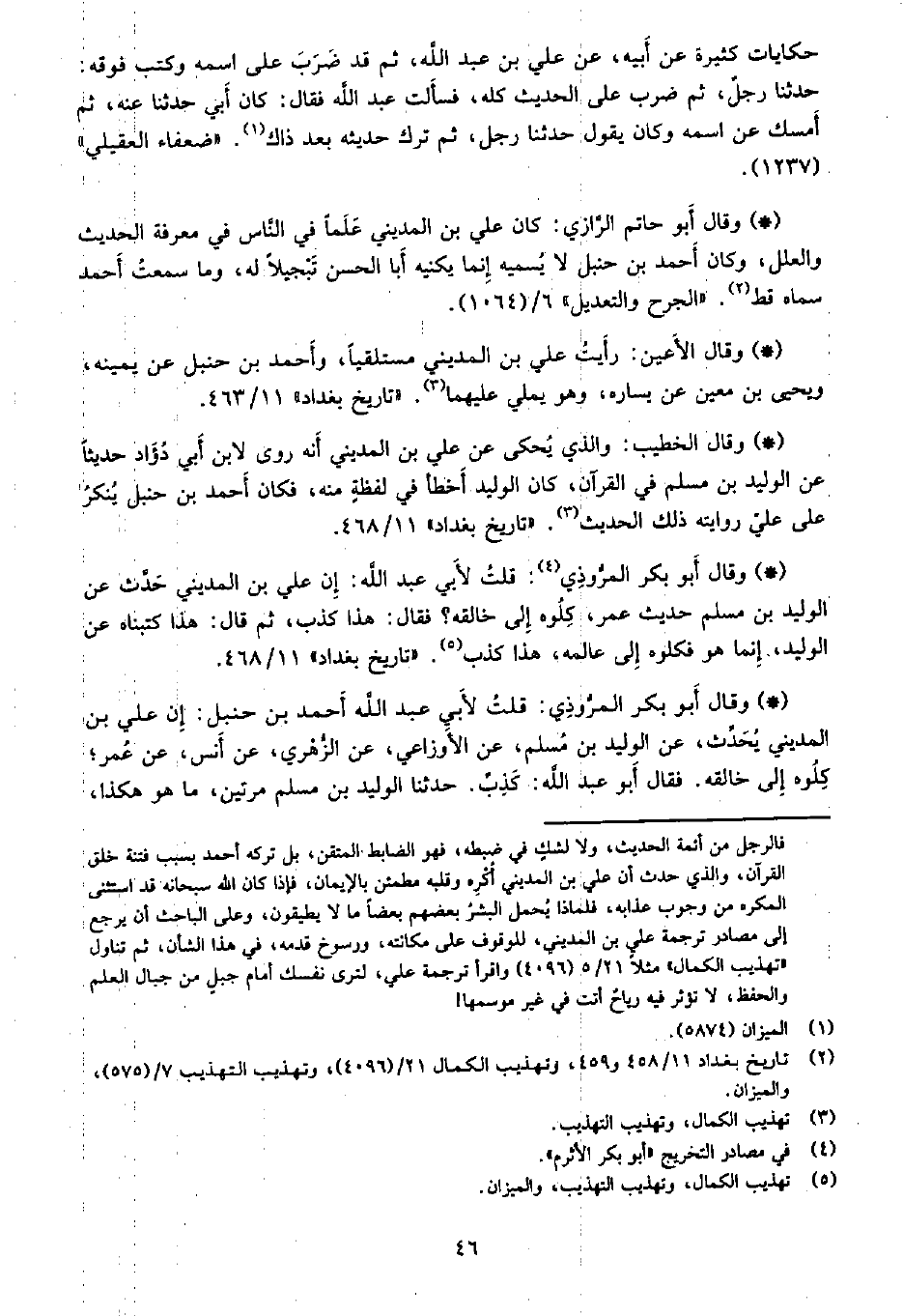 • وقال الخطيب: والذي يحكى عن علي بن المديني أنه روى لابن أبي داود حديثًا عن الوليد بن مسلم في القرآن، كان الوليد أخطأ في لفظة منه، فكان أحمد بن حنبل ينكر على علي روايته ذلك الحديث. «تاريخ بغداد» 11/468.