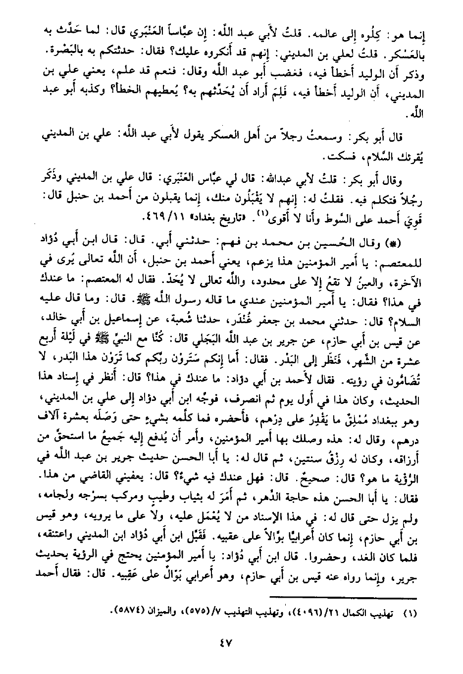 • وقال الحسين بن محمد بن فهم: حدثني أبي. قال: قال ابن أبي دؤاد للمعتصم: يا أمير المؤمنين هذا يزعم، يعني أحمد بن حنبل، أن الله تعالى يرى في الآخرة، والعين لا تقع إلا على محدود، والله تعالى لا يحد، فقال له المعتصم: ما عندك في هذا؟ فقال: يا أمير المؤمنين عندي ما قاله رسول الله - صلى الله عليه وسلم -، قال: وما قال عليه السلام؟ قال: حدثني محمد بن جعفر غندر، حدثنا شعبة، عن إسماعيل بن أبي خالد، عن قيس بن أبي حازم، عن جرير بن عبد الله البجلي قال: كنا مع النبي - صلى الله عليه وسلم - في ليلة أربع عشرة من الشهر، فنظر إلى البدر، فقال: أما إنكم سترون ربكم كما ترون هذا البدر، لا تضامون في رؤيته، فقال لاحمد بن أبى دؤاد: ما عندك فى هذا؟ قال: أنظر فى إسناد هذا الحديث، وكان هذا فى أول يوم ثم انصرف، فوجه ابن أبى دؤاد إلى علي بن المديني، وهو ببغداد مملق ما يقدر على درهم، فأحضره فما كلمه بشيء حتى وصله بعشرة آلاف درهم، وقال له: هذه وصلك بها أمير المؤمنين، وأمر أن يدفع إليه جمع ما استحق من أرزاقه، وكان له رزق سنتين، ثم قال له: يا أبا الحسن حديث جرير بن عبد الله في الرؤية ما هو؟ قال: صحيح، قال: فهل عندك فيه شيء؟ قال: يعفيني القاضي من هذا، فقال: يا أبا الحسن هذه حاجة الدهر، ثم أمر له بثياب وطيب ومركب بسرجه ولجامه، ولم يزل حتى قال له: في هذا الإسناد من لا يعمل عليه، ولا على ما يرويه، وهو قيس بن أبي حازم، إنما كان أعرابيًا بؤالاً على عقبيه، فقبل ابن أبي دؤاد ابن المديني، واعتنقه، فلما كان الغد، وحضروا، قال ابن أبي دؤاد: يا أمير المؤمنين يحتج في الرؤية بحديث جرير، وإنما رواه عنه قيس بن أبي حازم، وهو أعرابي بوال على عقبيه، قال: فقال أحمد