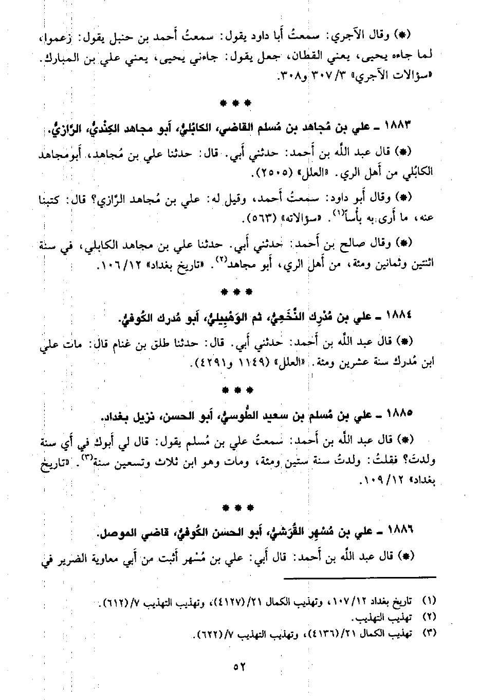 • وقال صالح بن أحمد: حدثني أبي، حدثنا علي بن مجاهد الكابلي، في سنة اثنتين وثمانين ومئة، من أهل الري، أبو مجاهد. «تاريخ بغداد» 12/106.