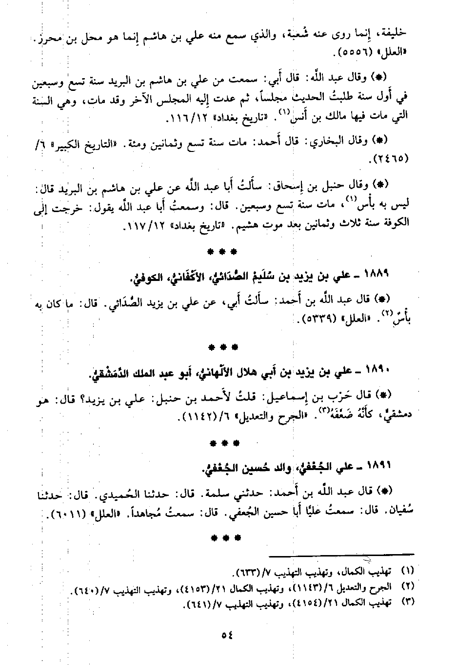 • وقال حنبل بن إسحاق: سألت أبا عبد الله عن علي بن هاشم بن البريد قال: ليس به بأس، مات سنة تسع وسبعين، قال: وسمعت أبا عبد الله يقول: خرجت إلى الكوفة سنة ثلاث وثمانين بعد موت هشيم. «تاريخ بغداد» 11/117.