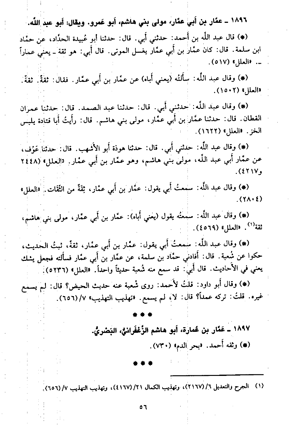 • وقال عبد الله: سَمِعتُهُ يقول (يعني أَباه) : عمار بن أبي عمار، مولى بني هاشم، ثقة. «العلل» (4569) .