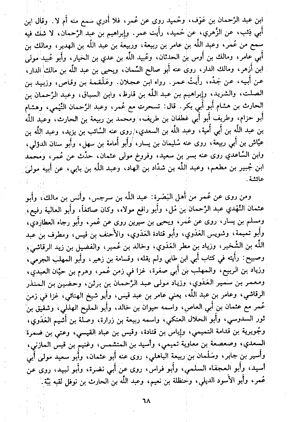 ومن روى عن عمر من أهل البصرة: عبد الله بن سرجس، وأنس بن مالك، وأبو عثمان النهدي عبد الرحمن بن مل، وأبو رافع مولاه، وكان صائغًا، وأبو العاليه رفيع، ومسلم بن يسار، روى عن عمر، ويحيى بن سيرين روى عن عمر، وأبو رجاء العطاردي، وأبو تميمة، وشويس العدوي، وأبو قتادة العدوي، والأحنف بن قيس، ومطرف بن عبد الله، وزياد بن مطر العدوي، وخالد بن عمير، والفضيل بن زيد الرقاشي، وصبيح: رأيته في كتاب أبي ابن طابي ولم يقله، وقسامة بن زهير، وأبو المهلب الجرمي، وزياد بن الربيع، والمهلب بن أبي صفرة، غزا في زمن عمر، وهرم بن حيان العبدي، ومعمر بن سمير العدوي، وزياد مولى عبد الرحمن بن برثن، وحضين بن المنذر الرقاشي، وعامر بن عبد الله، يعني عامر بن عبد قيس، وأبو شيخ الهنائي، غزا في زمن عمر مع عثمان بن أبي العاص، واسمه حيوان بن خالد، وأبو المليح الهذلي، وشقيق بن ثور السدوسي، وأبو الحلال العتكي، واسمه ربيعة بن زرارة، وصلة بن أثيم العدوي، وجويرية بن قدامة التميمي، وإياس بن قتادة، وقيس بن عباد القيسى، وعتي بن ضمرة السعدي، وصعصعة بن معاوية تميمي، وأسيد بن المتشمس، وغنيم بن قيس المازني، وأسير بن جابر، وسليمان بن ربيعة الباهلي، روى عنه أبو عثمان، وأبو سعيد مولى أبي أسيد، وأبو العجفاء السلمي، وأبو فراس، روى عن أبي نضرة، وأبو لبيد، روى عن عمر، وأبو الأسود الديلي، وحنظلة بن نعيم، وعبد الله بن الحارث بن نوفل لقبه ببة.