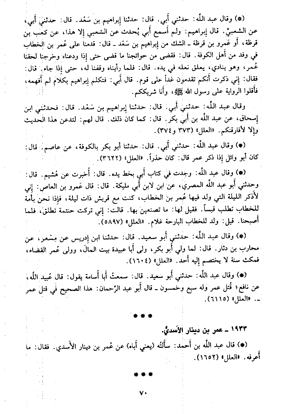 • وقال عبد الله: حدثني أبو سعيد، قال: سمعت أبا أسامة يقول: قال عُبيد الله، عن نافع؛ قتل عمر وله سبع وخمسون -قال أبو عبد الرحمن: هذا الصحيح في قتل عمر -. «العلل» (6115) .