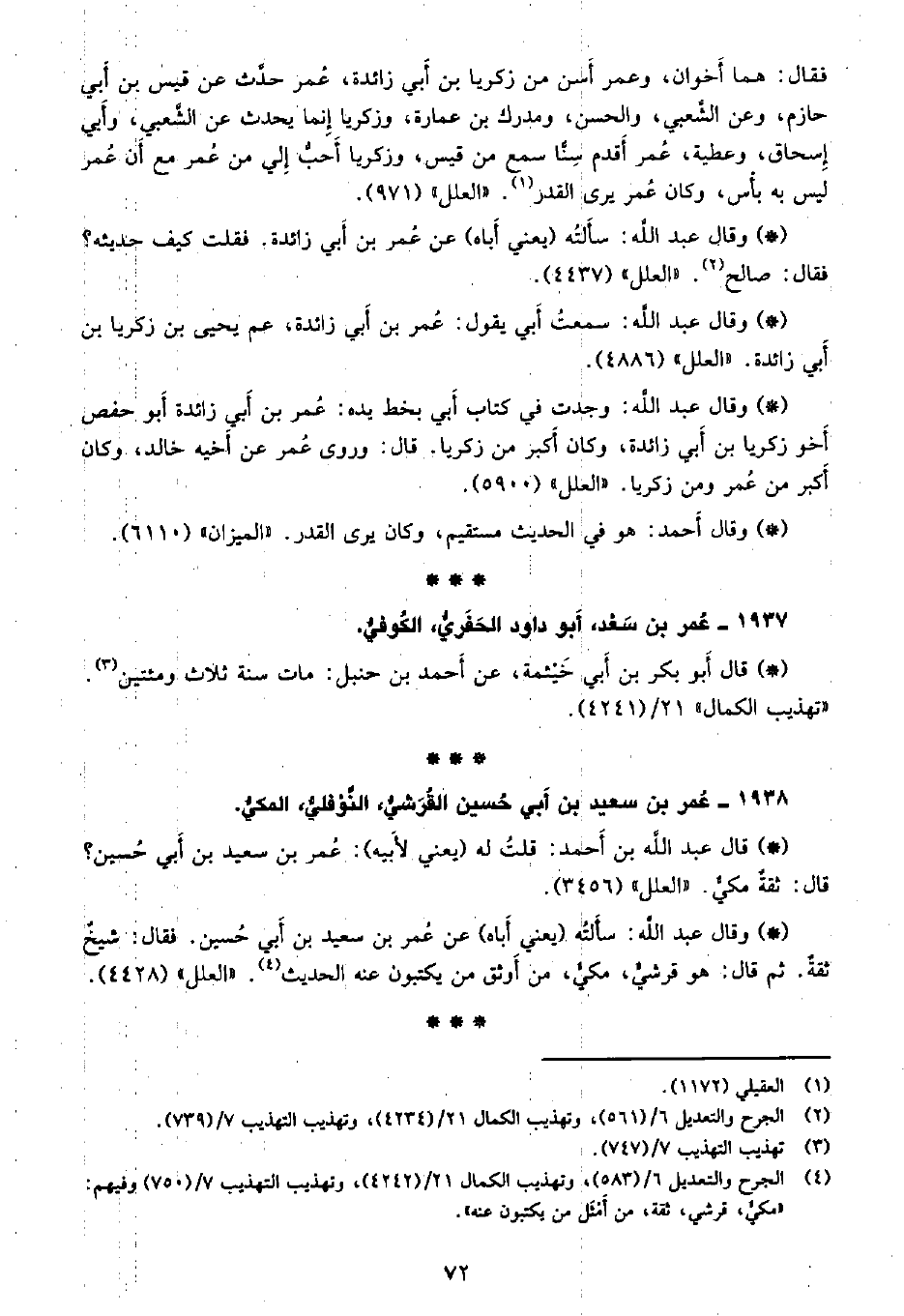 فقال: هما أخوان، وعمر أسن من زكريا بن أبي زائدة، عمر حدث عن قيس بن أبي حازم، وعن الشعبي، والحسن، ومدرك بن عمارة، وزكريا إنما يحدث عن الشعبي، وأبي إسحاق، وعطية، عمر أقدم سنًا سمع من قيس، وزكريا أحب إلي من عمر مع أن عمر ليس به بأس، وكان عمر يرى القدر. «العلل» (971) .