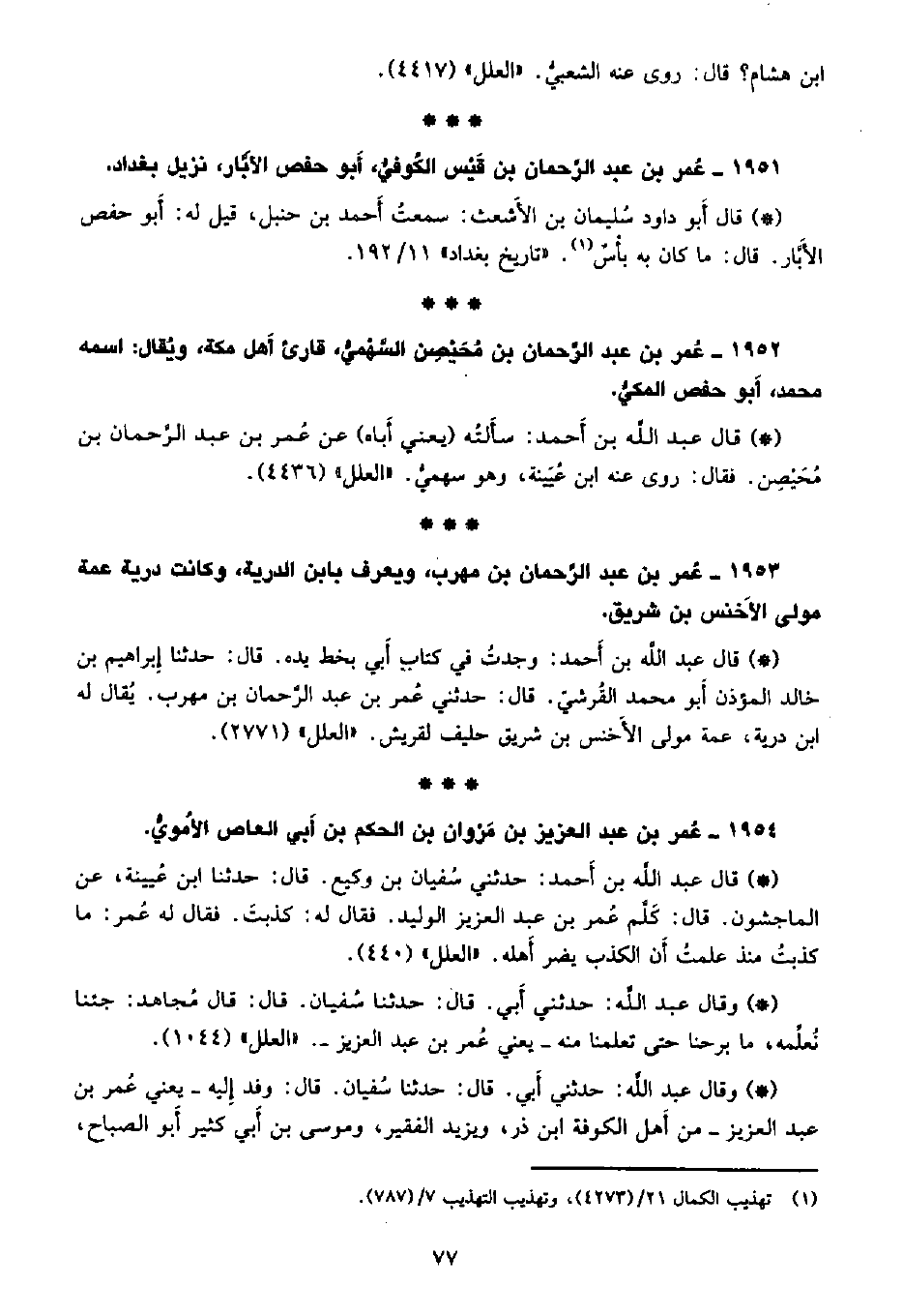 • قال عبد الله بن أحمد: سألته (يعني أَباه) عن عمر بن عبد الرحمن بن محيصن، فقال: روى عنه ابن عيينة، وهو سهمي. «العلل» (4436) .