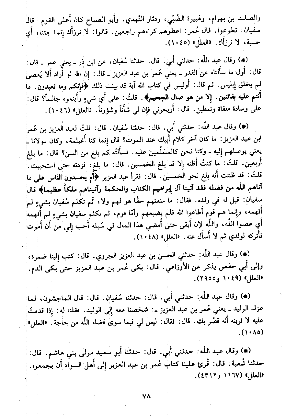 • وقال عبد الله: حدثني أبي. قال: حدثنا سفيان، عن ابن ذر -يعني عمر - قال: قال: أول ما سألناه عن القدر -يعني عمر بن عبد العزيز - قال: إن الله لو أراد ألا يعصى لم يخلق إبليس، ثم قال: أوليس في كتاب الله آية قد بينت ذلك " فَإِنَّكُمْ وَمَا تَعْبُدُونَ (*) مَا أَنْتُمْ عَلَيْهِ بِفَاتِنِينَ (*) إِلَّا مَنْ هُوَ صَالِ الْجَحِيمِ "، قلت: على أي شيء رأيتموه جالسًا؟ قال: على وسادة ملقاة ونمطين، قال: أريحوني فإن لي شأنًا وشؤونًا. «العلل» (1046) .