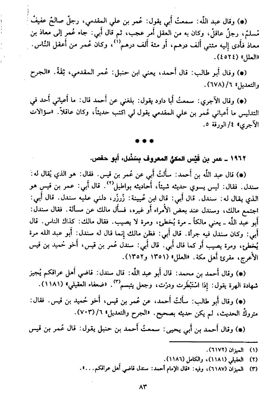 • وقال أبو طالب: قال أحمد، يعني ابن حنبل: عمر المقدمي، ثقة. «الجرح والتعديل» 6/ (678) .