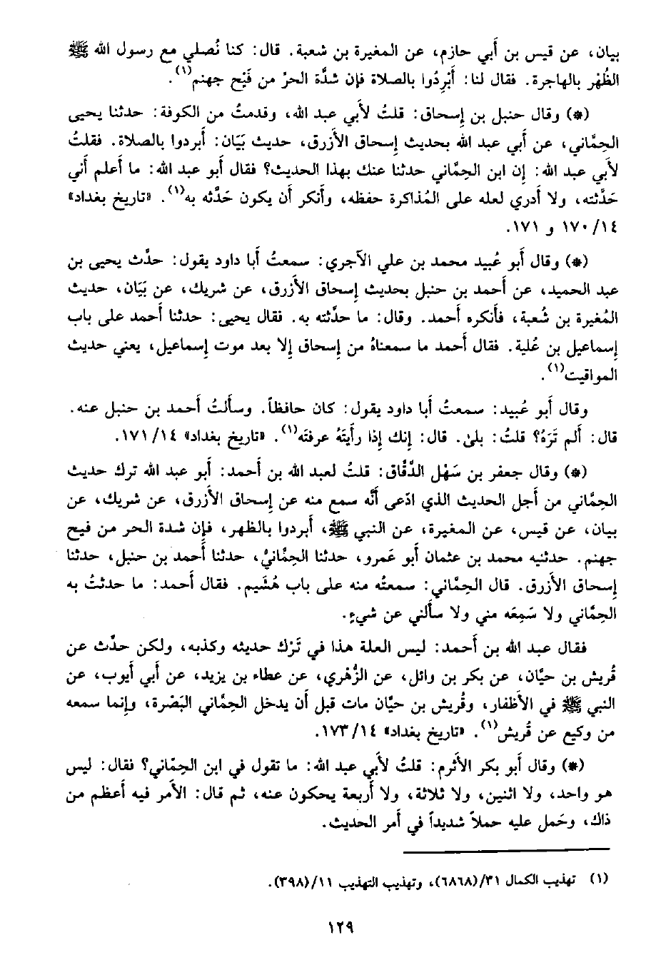 • وقال حنبل بن إسحاق: قلت لأبي عبد الله، وقدمت من الكوفة: حدثنا يحيى الحماني، عن أبي عبد الله بحديث إسحاق الأزرق، حديث بيان: أبردوا بالصلاة. فقلت لأبي عبد الله: إن ابن الحماني حدثنا عنك بهذا الحديث؟ فقال أبو عبد الله: ما أعلم أني حدثته، ولا أدري لعله على المذاكرة حفظه، وأنكر أن يكون حدثه به. «تاريخ بغداد» 14/170 و171.