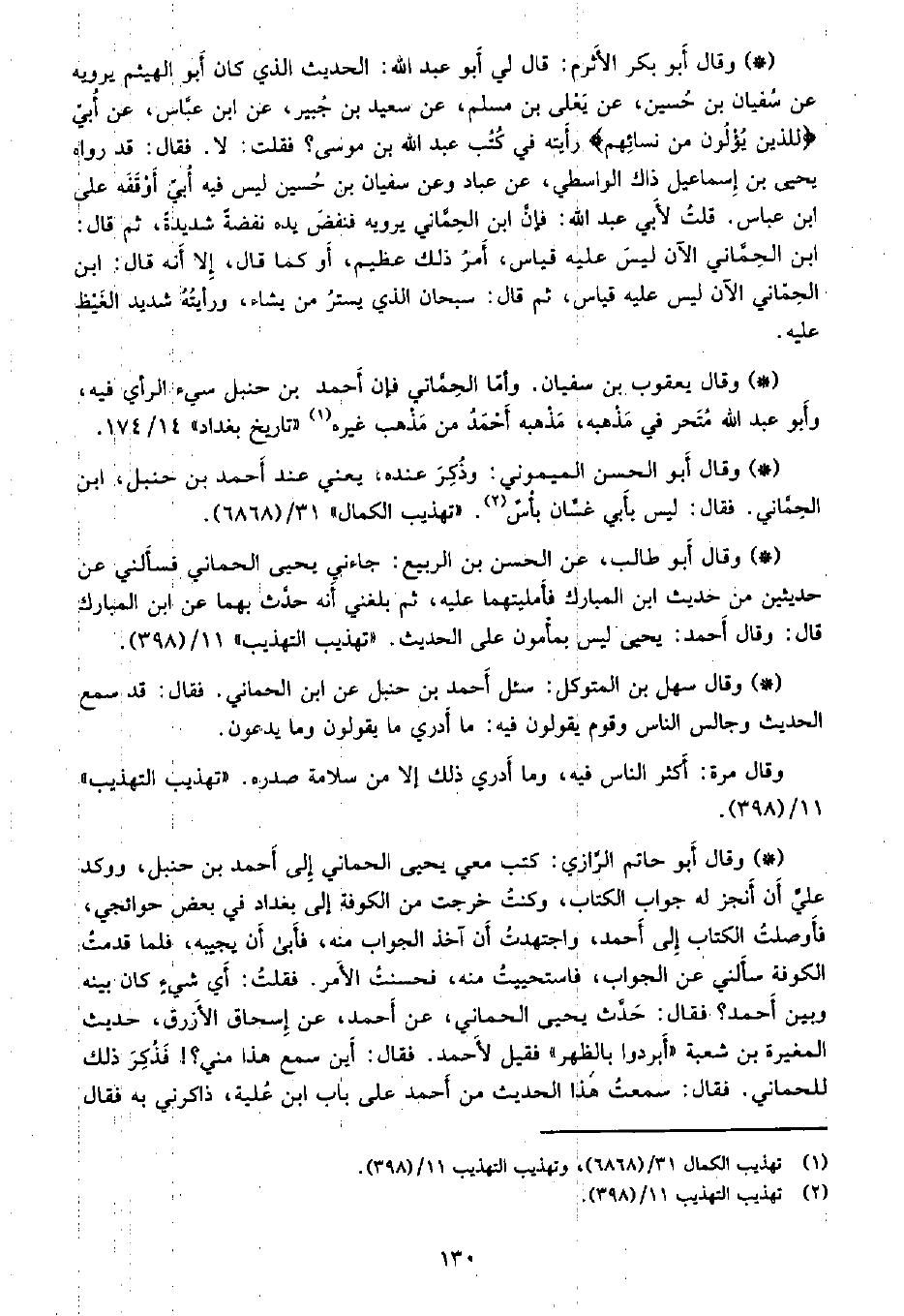 • وقال يعقوب بن سفيان، وأما الحماني فإن أحمد بن حنبل سيء الرأي فيه، وأبو عبد الله متحر في مذهبه، مذهبه أحمد من مذهب غيره. «تاريخ بغداد» 14/174.