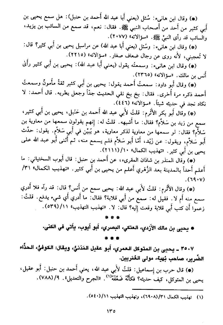 • وقال أبو بكر الأثرم: قلت لأبى عبد الله أحمد بن حنبل، يحيى بن أبي كثير، سمع من زيد بن سلام؟ فقال: ما أشبهه. قلت له: إنهم يقولون سمعها من معاويه بن سلام؟ فقال: لو سمعها من معاويه لذكر معاويه، هو يبين فى أبي سلام. يقول: حدث أبو سلام، ويقول: عن زيد، أما أبو سلام فلم يسمع منه، ثم أثنى أبو عبد الله على يحيى بن أبي كثير. «تهذيب الكمال» 10/ (2111) .