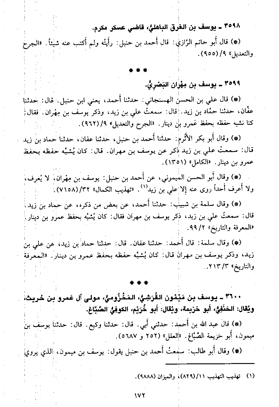 • وقال أبو الحسن الميموني، عن أحمد بن حنبل، يوسف بن مهران، لا يعرف، ولا أعرف أحدًا روى عنه إلا علي بن زيد. «تهذيب الكمال» 32/ (7158) .