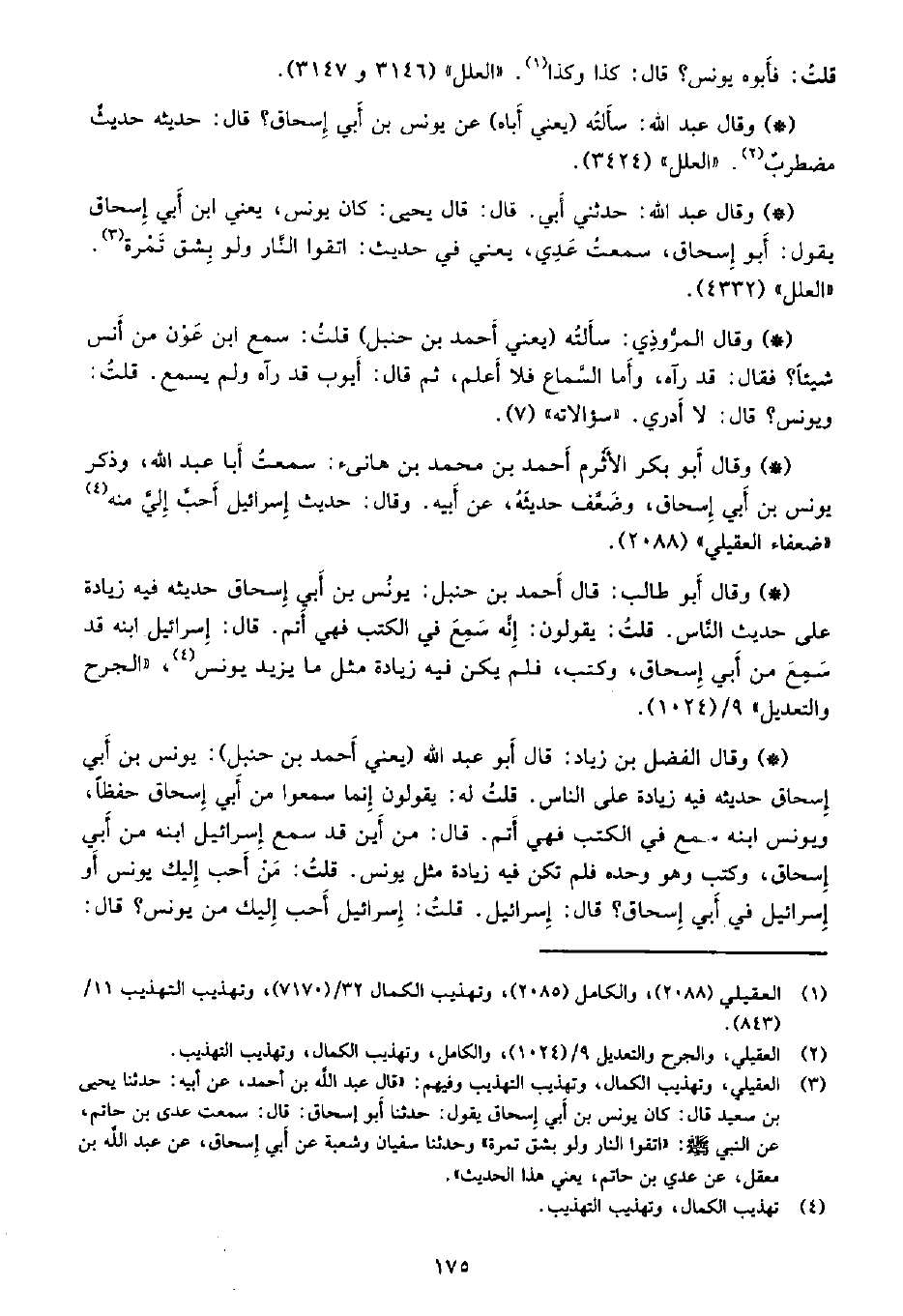 • وقال أبو طالب: قال أحمد بن حنبل: يونس بن أبي إسحاق حديثه فيه زيادة على حديث الناس. قلت: يقولون: أنه سمع في الكتب فهي أتم. قال: إسرائيل ابنه قد سمع من أبي إسحاق، وكتب، فلم يكن فيه زيادة مثل ما يزيد يونس. «الجرح والتعديل» 9/ (1024) .