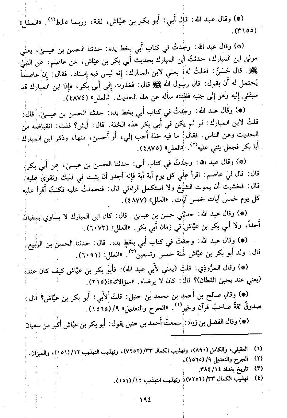 • وقال الفضل بن زياد: سمعت أحمد بن حنبل يقول: أبو بكر بن عياش أكبر من سفيان