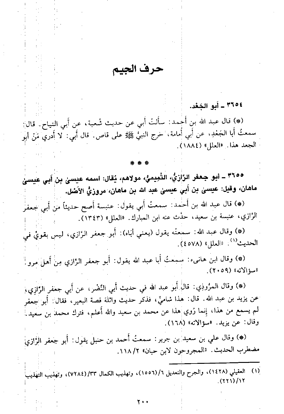 3655 - أبو جعفر الرازي، التميمي، مولاهم، يقال: اسمه عيسى بن أبي عيسى ماهان، وقيل: عيسى بن أبي عيسى عبد الله بن ماهان، مروزي الأصل.