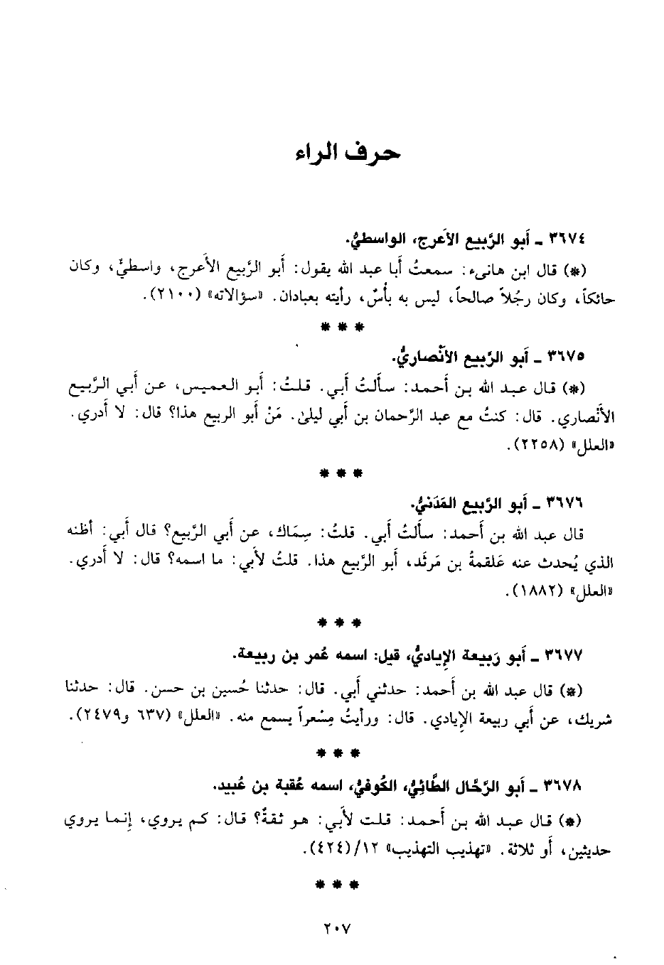 • قال ابن هانىء: سمعت أبا عبد الله يقول: أبو الربيع الأعرج، واسطي، وكان حائكًا، وكان رجلاً صالحًا، ليس به بأس، رأيته بعبادان. «سؤالاته» (2100) .