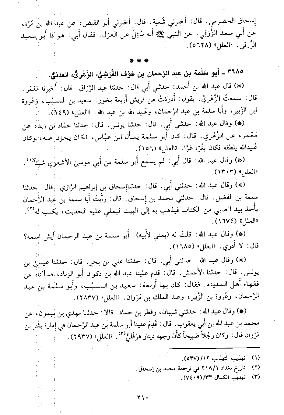 • وقال عبد الله: قلت له (يعني لأبيه) : أبو سلمه بن عبد الرحمن أيش اسمه؟ قال: لا أدري. «العلل» (1685) .
