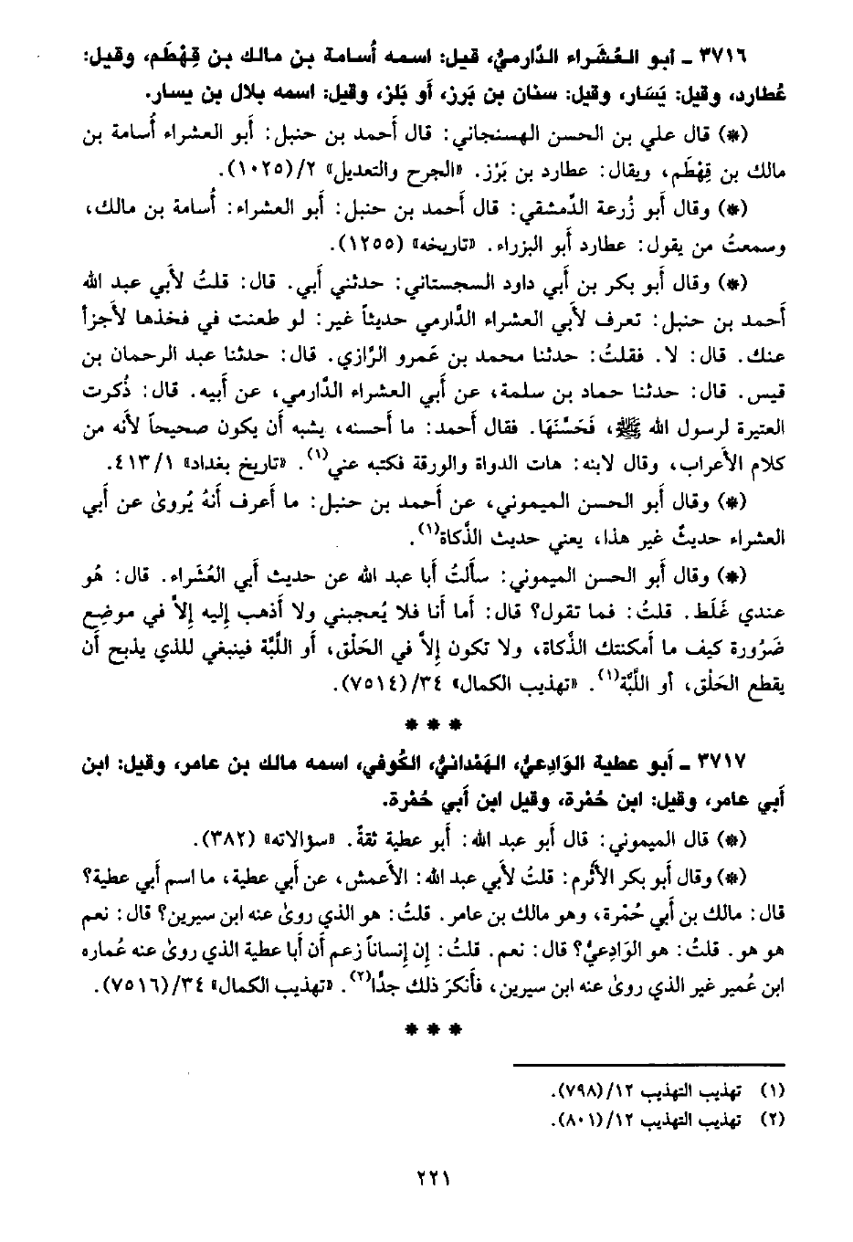 • وقال أبو زرعة الدمشقي: قال أحمد بن حنبل: أبو العشراء: أسامه بن مالك، وسمعت من يقول: عطارد أبو البزراء. «تاريخه» (1255) .