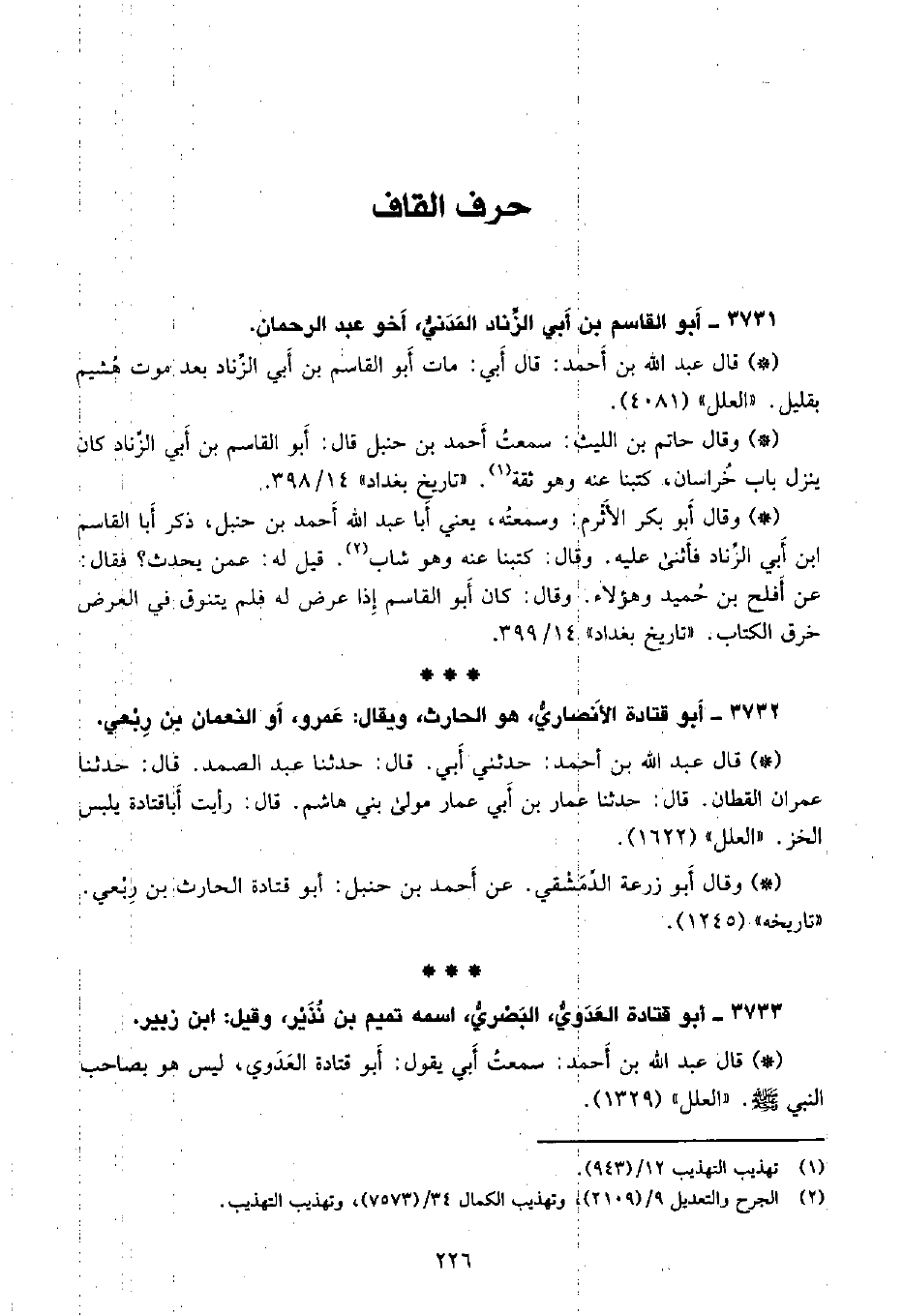 • وقال أبو بكر الأثرم: وسَمِعتُهُ، يعني أبا عبد الله أحمد بن حنبل، ذكر أبا القاسم بن أبي الزناد فأثنى عليه. وقال: كتبنا عنه وهو شاب. قيل له: عمن يحدث؟ فقال: عن أفلح بن حميد وهؤلاء. وقال: كان أبو القاسم إذا عرض له فلم يتنوق في العرض خرق الكتاب. 14/399.