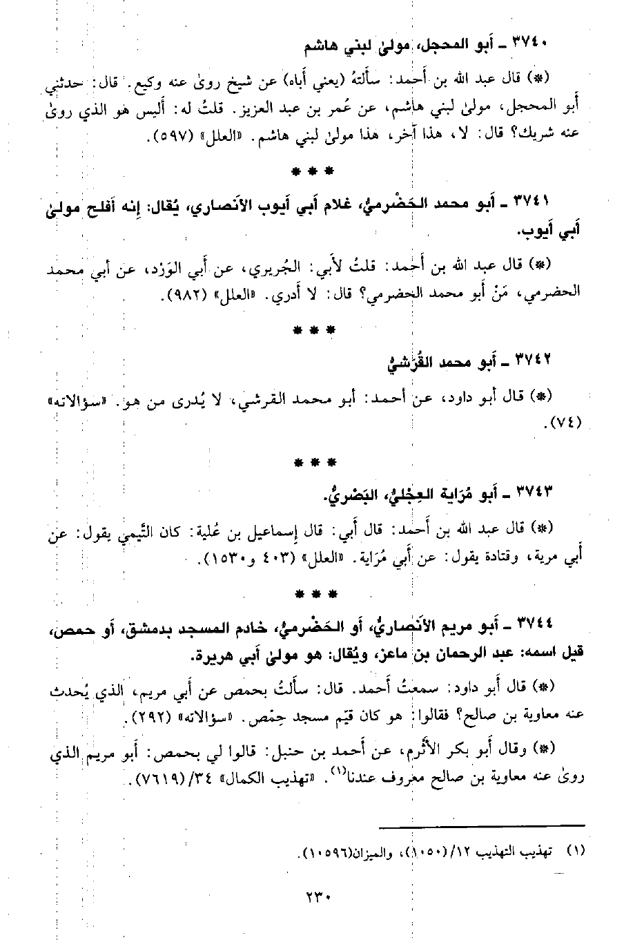 • قال عبد الله بن أحمد: سألته (يعني أباه) عن شيخ روى عنه وكيع. قال: حدثني أبو المحجل، مولى لبني هاشم، عن عمر بن عبد العزيز. قلت له: أليس هو الذي روى عنه شريك؟ قال: لا، هذا آخر، هذا مولى لبني هاشم. «العلل» (597) .