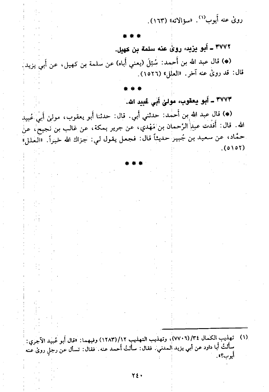 • قال عبد الله بن أحمد: حدثني أبي: قال: حدثنا أبو يعقوب، مولى أبي عبيد الله. قال: أفدت عبد الرحمن بن مهدي، عن جرير بمكة، عن غالب بن نجيح، عن حماد، عن سعيد بن جبير حديثًا قال: فجعل يقول لي: جزاك الله خيرًا. «العلل» (5152) .