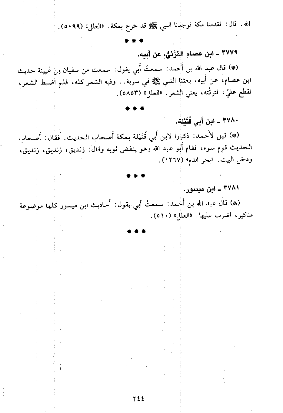 • قيل لأحمد: ذكروا لابن أبي قُتَيلة بمكة أصحاب الحديث. فقال: أصحاب الحديث قوم سوء، فقام أبو عبد الله وهو ينفض ثوبه وقال: زنديق، زنديق، زنديق، ودخل البيت. «بحر الدم» (1267) .