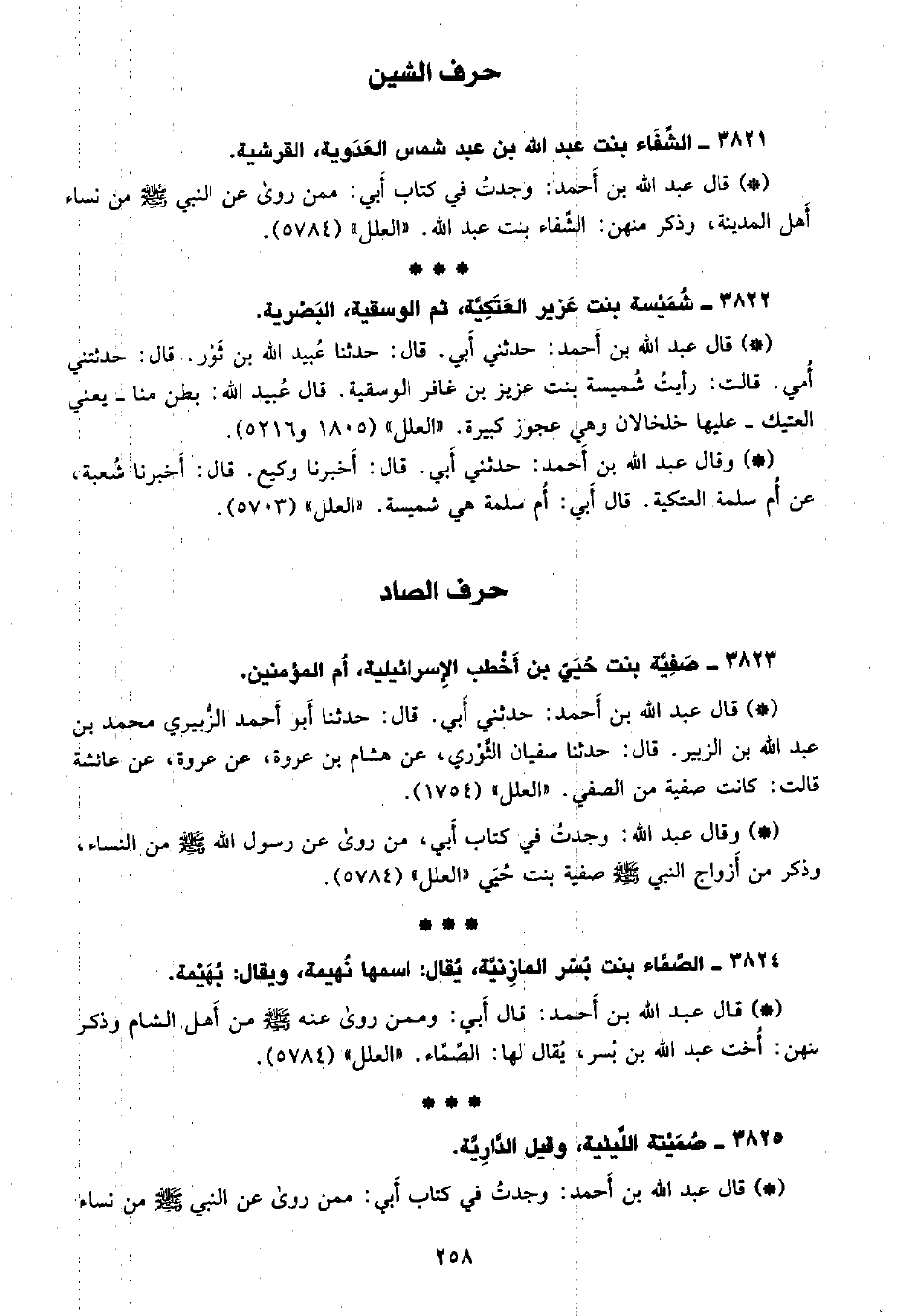 • وقال عبد الله: وجدت في كتاب أبي، من روى عن رسول الله صلى الله عليه وسلم من النساء، وذكر من أزواج النبي صلى الله عليه وسلم صفية بنت حُيي. «العلل» (5784) .