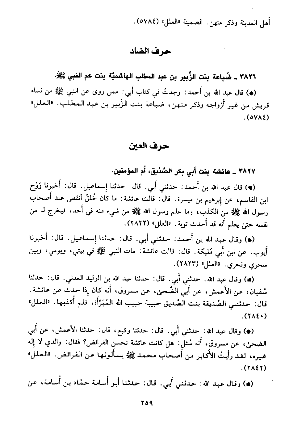 • وقال عبد الله: حدثني أبي. قال: حدثنا وكيع، قال: حدثنا الأعمش، عن أبي الضحى، عن مسروق، أنه سئل: هل كانت عائشة تحسن الفرائض؟ فقال: والذي لا إله غيره، لقد رأيت الأكابر من أصحاب محمد صلى الله عليه وسلم يسألونها عن الفرائض. «العلل» (2842) .