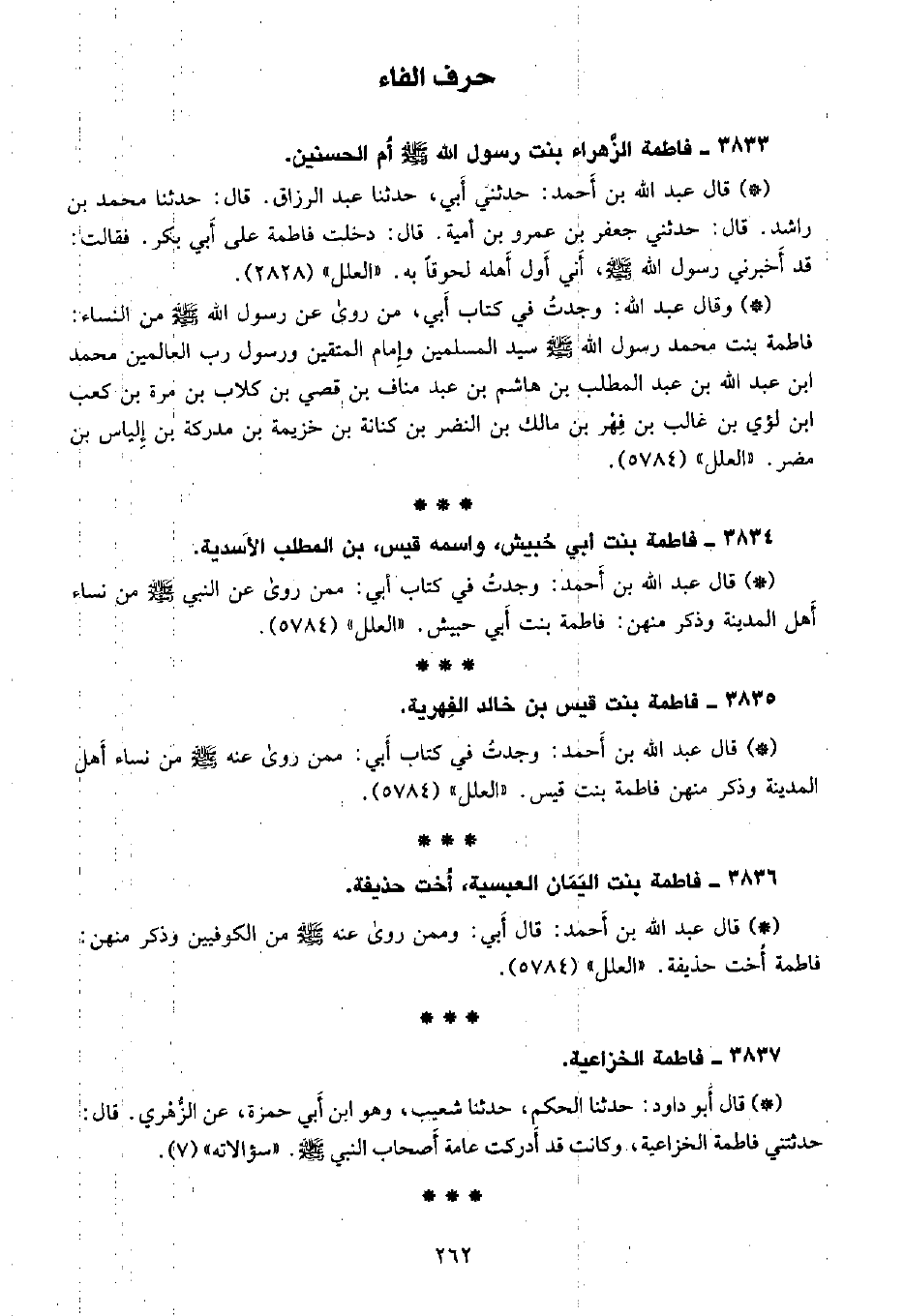 • وقال عبد الله: وجدت في كتاب أبي، من روى عن رسول الله صلى الله عليه وسلم من النساء: فاطمه بنت محمد رسول الله صلى الله عليه وسلم سيد المسلمين وإمام المتقين ورسول رب العالمين محمد بن عبد الله بن عبد المطلب بن هاشم بن عبد مناف بن قصي بن كلاب بن مره بن كعب بن لؤي بن غالب بن فهر بن مالك بن النضر بن كنانه بن خزيمة بن مدركة بن إلياس بن مضر. «العلل» (5784) .