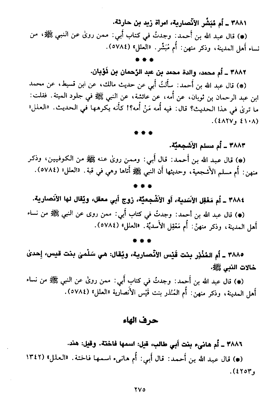 • قال عبد الله بن أحمد: وجدت في كتاب أبي: ممن روى عن النبي صلى الله عليه وسلم من نساء أهل المدينة، وذكر منهن: أم المنذر بنت قيس الأنصارية. «العلل» (5784) .