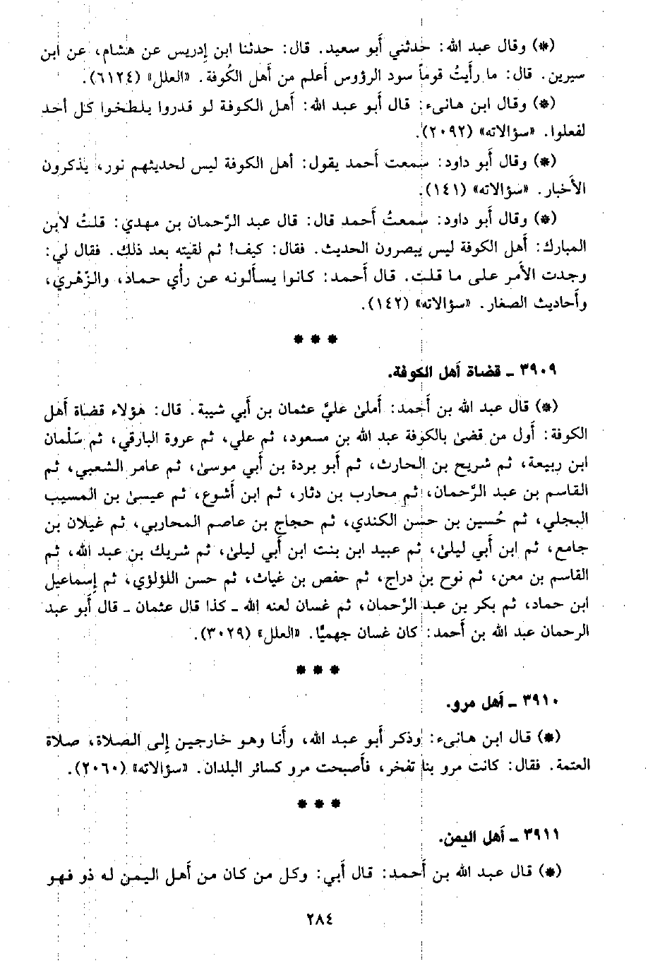 • وقال عبد الله: حدثني أبو سعيد. قال: حدثنا ابن إدريس، عن هشام، عن ابن سيرين. قال: ما رأيت قومًا سود الرؤوس أعلم من أهل الكوفة. «العلل» (6124) .