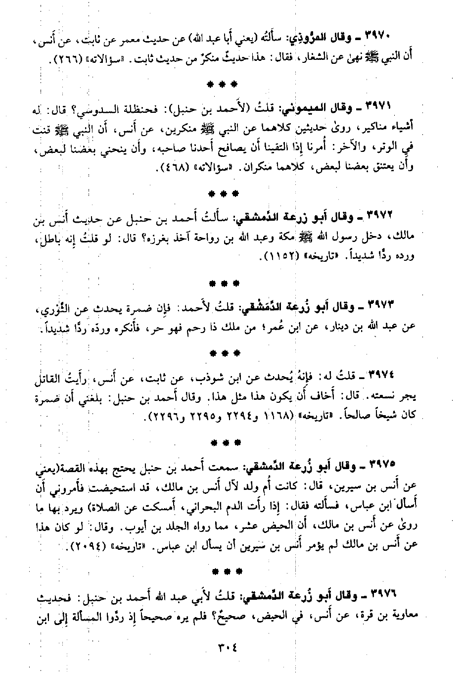 3976 - وقال أبو زرعة الدمشقي: قلت لأبي عبد الله أحمد بن حنبل: فحديث معاوية بن قرة، عن أنس، في الحيض، صحيح؟ فلم يره صحيحًا أن ردوا المسألة إلى ابن