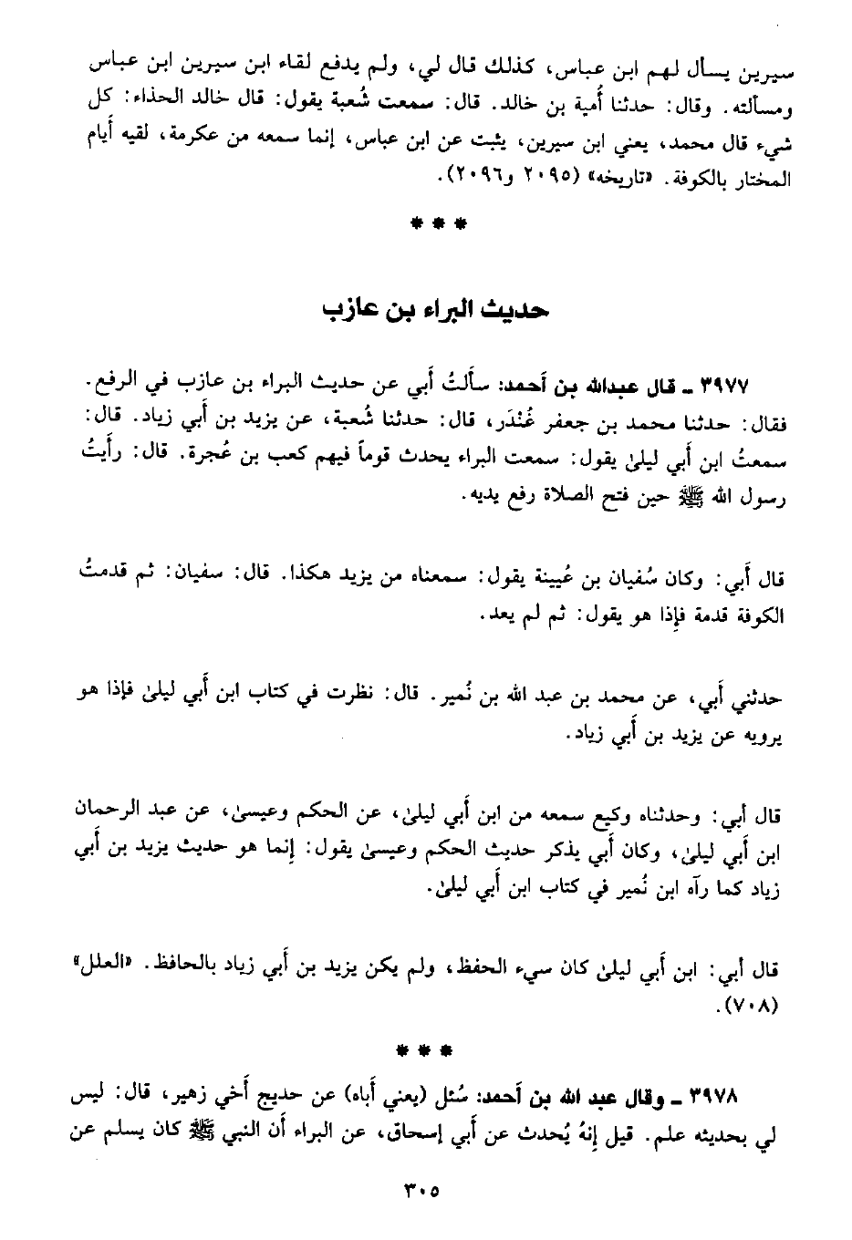 3977 - قال عبد الله بن أحمد: سألت أبي عن حديث البراء بن عازب في الرفع. فقال: حدثنا محمد بن جعفر غندر، قال: حدثنا شعبة، عن يزيد بن أبي زياد. قال: سمعت ابن أبي ليلى يقول: سمعت البراء يحدث قومًا فيهم كعب بن عجرة. قال: رأيت رسول الله - صلى الله عليه وسلم - حين فتح الصلاة رفع يديه.