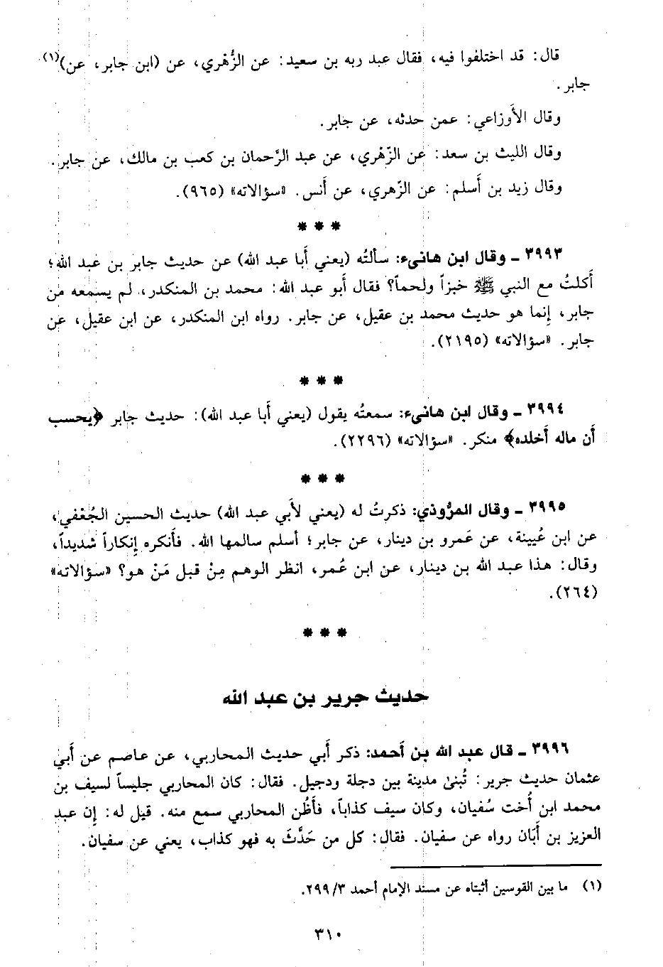 3994 - وقال ابن هانىء: سَمِعتُهُ يقول (يعني أبا عبد الله) : حديث جابر " يَحْسَبُ أَنَّ مَالَهُ أَخْلَدَهُ " منكر. «سؤالاته» (2296) .