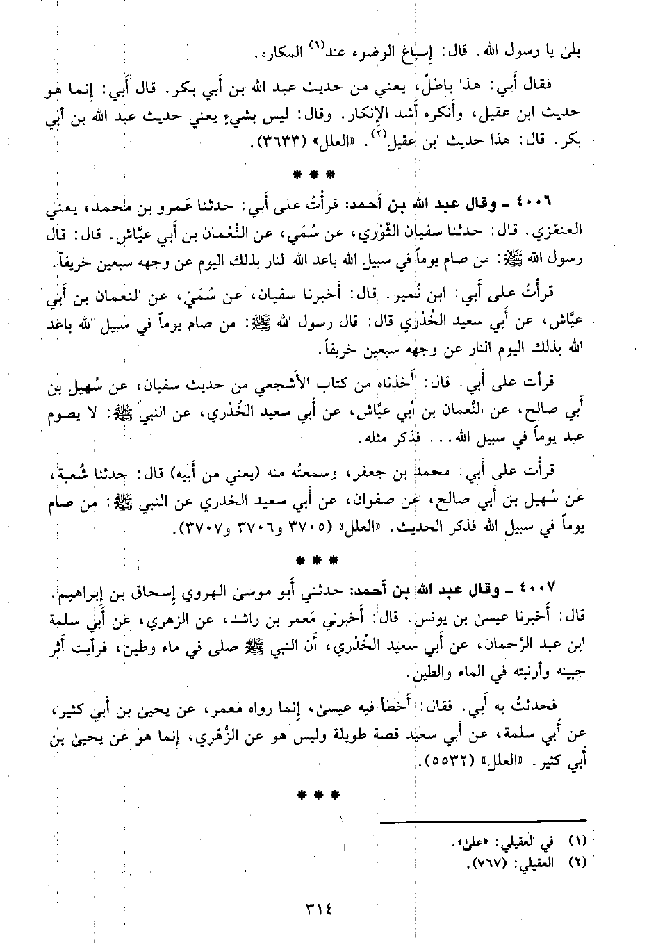 قرأت على أبي: محمد بن جعفر، وسمعته منه (يعني من أبيه) قال: حدثنا شعبه، عن سهيل بن أبي صالح، عن صفوان، عن أبي سعيد الخدري، عن النبي - صلى الله عليه وسلم -: من صام يومًا في سبيل الله ... فذكر الحديث. «العلل» (3705 و3706 و3707) .