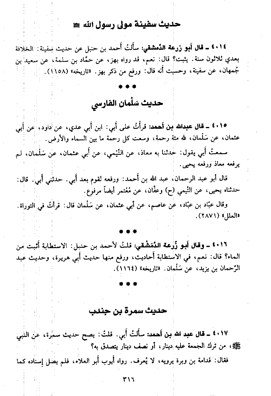4014 - قال أبو زرعة الدمشقي: سألت أحمد بن حنبل عن حديث سفينة، الخلافة بعدي ثلاثون سنة، يثبت؟ قال: نعم، قد رواه بهز، عن حماد بن سلمة، عن سعيد بن جمهان، عن سفينة، وحسبت أنه قال: ورفع من ذكر بهز. «تاريخه» (1158) .