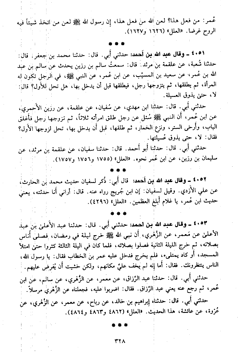 4051 - وقال عبد الله بن أحمد: حدثني أبي. قال: حدثنا محمد بن جعفر. قال: حدثنا شعبة، عن علقمة بن مرثد. قال: سعت سالم بن رزين يحدث عن سالم بن عبد الله بن عمر، عن سعيد بن المسيب، عن ابن عمر، عن النبي - صلى الله عليه وسلم -، فى الرجل تكون له المرأة، ثم طلقها، ثم تزوجها رجل، فطلقها قبل أن يدخل بها، هل تحل للأول؟ قال: لا، حتى تذوق العسيلة.