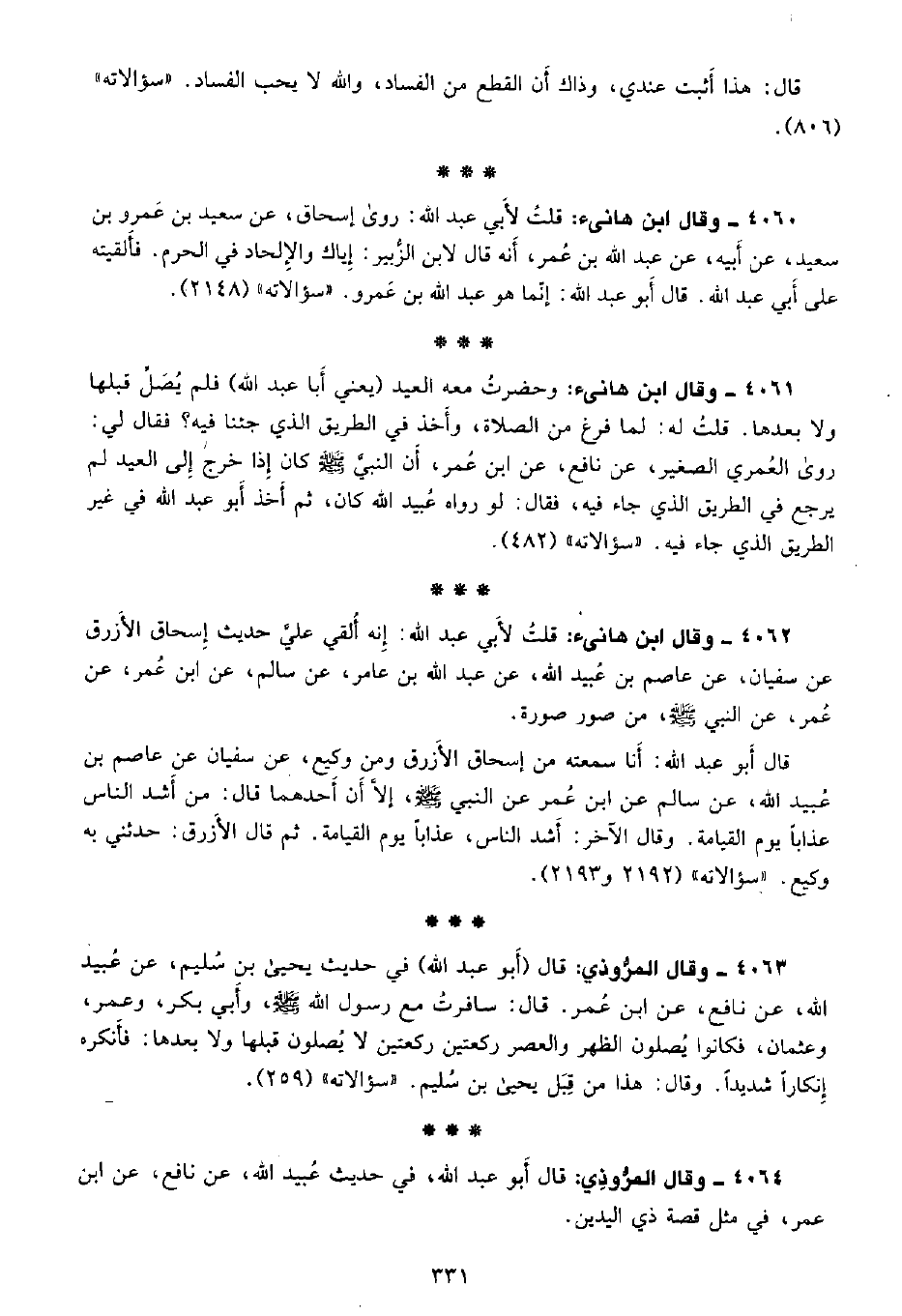 4060 - وقال ابن هانىء: قلت لأبي عبد الله: روى إسحاق، عن سعيد بن عمرو بن سعيد، عن أبيه، عن عبد الله بن عمر، أنه قال لابن الزبير: إياك وا?لحاد في الحرم. فألقيته على أبي عبد الله. قال أبو عبد الله: إنما هو عبد الله بن عمرو. «سؤالاته» (2148) .