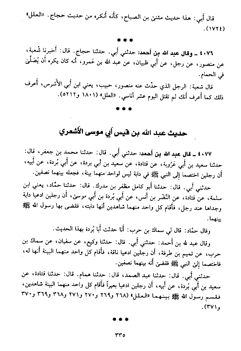 حدثني أبي. قال: حدثنا عبد الصمد. قال: حدثنا همام. قال: حدثنا قتادة، عن سعيد بن أبي بردة، عن أبيه، أن رجلين ادعيا بعيرًا فأقام كل واحد منهما البينة شاهدين، فقسم رسول الله - صلى الله عليه وسلم - بينهما. «العلل» (268 و269 و270 و271 و368 و369 و370 و371) .