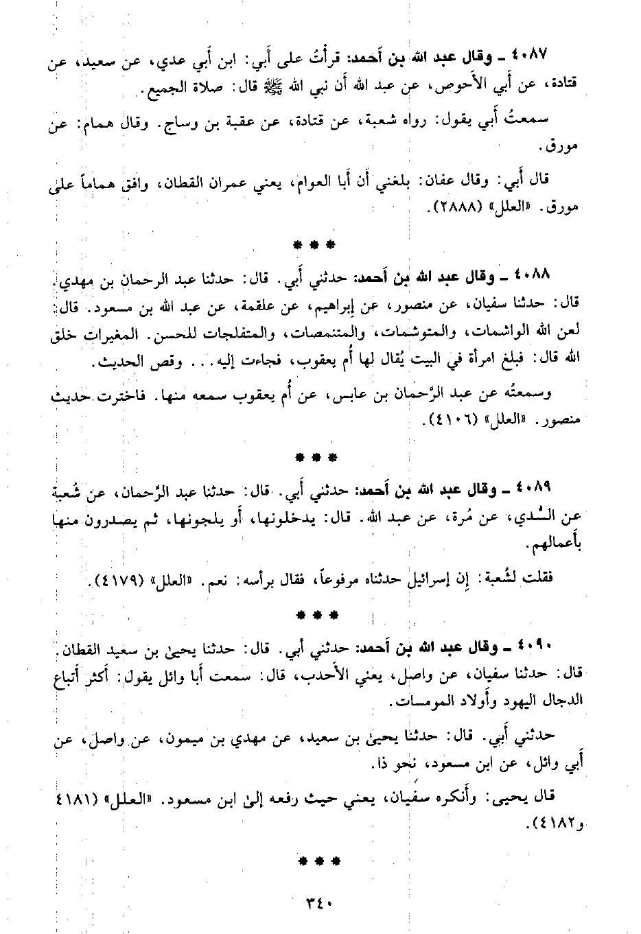 4088 - وقال عبد الله بن أحمد: حدثني أبي. قال: حدثنا عبد الرحمن بن مهدي. قال: حدثنا سفيان، عن منصور، عن إبراهيم، عن علقمة، عن عبد الله بن مسعود. قال: لعن الله الواشمات، والمتوشمات، والمتنمصات، والمتفلجات للحسن، المغيرات خلق الله قال: فبلغ امرأة في البيت يقال لها أم يعقوب، فجاءت إليه ... وقص الحديث.