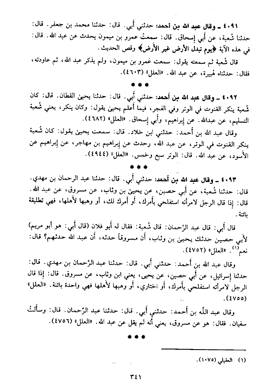 4092 - وقال عبد الله بن أحمد: حدثني أبي. قال: حدثنا يحيى القطان. قال: كان شعبة ينكر القنوت في الوتر وفي الفجر، فيما أعلم يحيى يقول: وكان ينكر، يعني شعبة التسليم، عن عبد الله، عن إبراهيم، وأبي إسحاق. «العلل» (4682) .