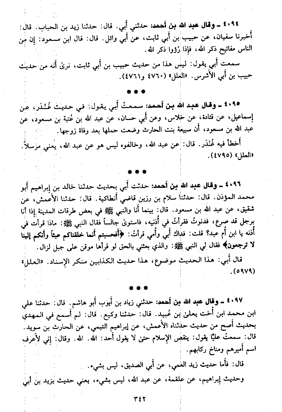 4095 - وقال عبد الله بن أحمد: سمعتُ أَبي يقول: في حديث غندر، عن إسماعيل، عن قتادة، عن خلاس، وعن أبي حسان، عن عبد الله بن عتبة بن مسعود، عن عبد الله بن مسعود، أن سبيعة بنت الحارث وضعت حملها بعد وفاة زوجها.