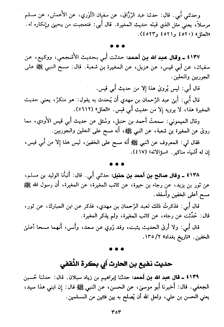 4138 - وقال صالح بن أحمد بن حنبل: حدثني أبي. قال: أنبأنا الوليد بن مسلم، عن ثور بن يزيد، عن رجاء بن حيوة، عن كاتب المغيرة، عن المغيرة، أن رسول الله - صلى الله عليه وسلم - مسح أعلى الخفين وأسفله.