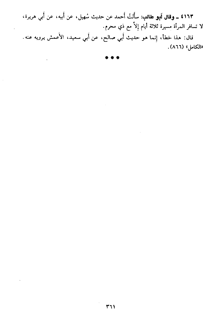 4163 - وقال أبو طالب: سألت أحمد عن حديث سهيل، عن أبيه، عن أبي هريرة، لا تسافر المرأة مسيرة ثلاثة أيام إلا مع ذي محرم.