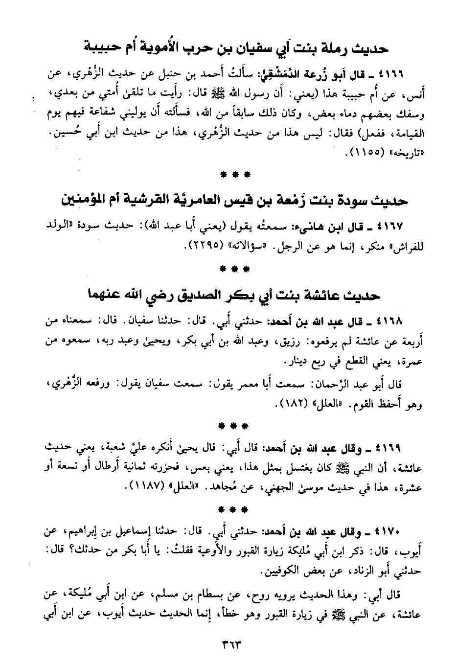 4166 - قال أبو زرعة الدمشقي: سألت أحمد بن حنبل عن حديث الزهري، عن أنس، عن أم حبيبة هذا (يعني: أن رسول الله - صلى الله عليه وسلم - قال: رأيت ما تلقى أمتي من بعدي، وسفك بعضهم دماء بعض، قال ذلك سابقًا من الله، فسألته أن يولني شفاعة فيهم يوم القيامة، ففعل) فقال: ليس هذا من حديث الزهري، هذا من حديث ابن أبي حسين. «تاريخه» (1155) .