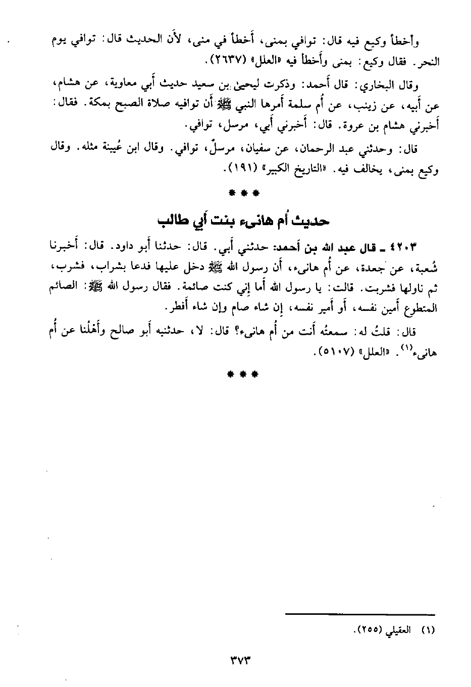 وقال البخاري: قال أحمد: وذكرت ليحيى بن سعيد حديث أبي معاوية، عن هشام، عن أبيه، عن زينب، عن أم سلمة أمرها النبي - صلى الله عليه وسلم - أن توافيه صلاة الصبح بمكة. فقال: أخبرني هشام بن عروة. قال: أخبرني أبي، مرسل، توافي.