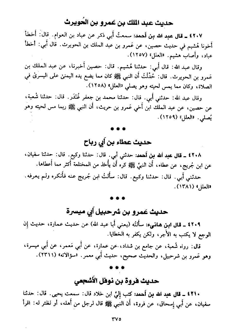 وقال عبد الله: حدثني أبي. قال: حدثنا محمد بن جعفر غندر. قال: حدثنا شعبة، عن حصين، عن عبد الملك ابن أخي عمرو بن حريث، أن النبي - صلى الله عليه وسلم - ربما يمس لحيته وهو يصلي. «العلل» (1259) .